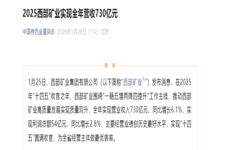 【中国有色金属杂志】2025西部矿业实现全年营收730亿元