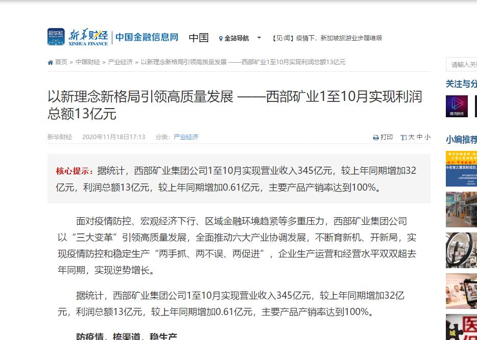 核心提示:据统计,西部矿业集团公司1至10月实现营业收入345亿元,较上年同期增加32亿元,利润总额13亿元,较上年同期增加0.61亿元,主要产品产销率达到100%。