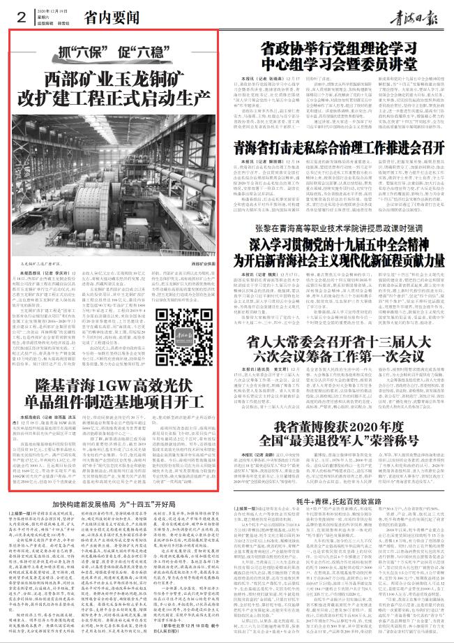 本报昌都讯 (记者 李庆玲) 12月18日,西部矿业西藏玉龙铜业股份有限公司改扩建工程在西藏自治区昌都市玉龙铜矿举行生产启动仪式,标志着玉龙铜矿改扩建工程正式启动生产,这也意味着玉龙铜矿进入绿色高效开发的新阶段。
