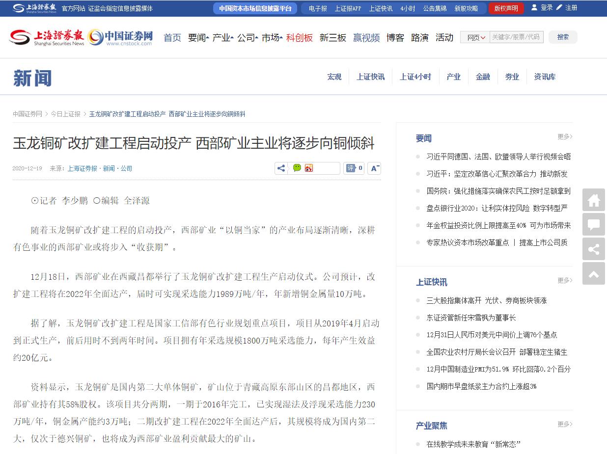 12月18日,西部矿业在西藏昌都举行了玉龙铜矿改扩建工程生产启动仪式。公司预计,改扩建工程将在2022年全面达产,届时可实现采选能力1989万吨/年,年新增铜金属量10万吨。