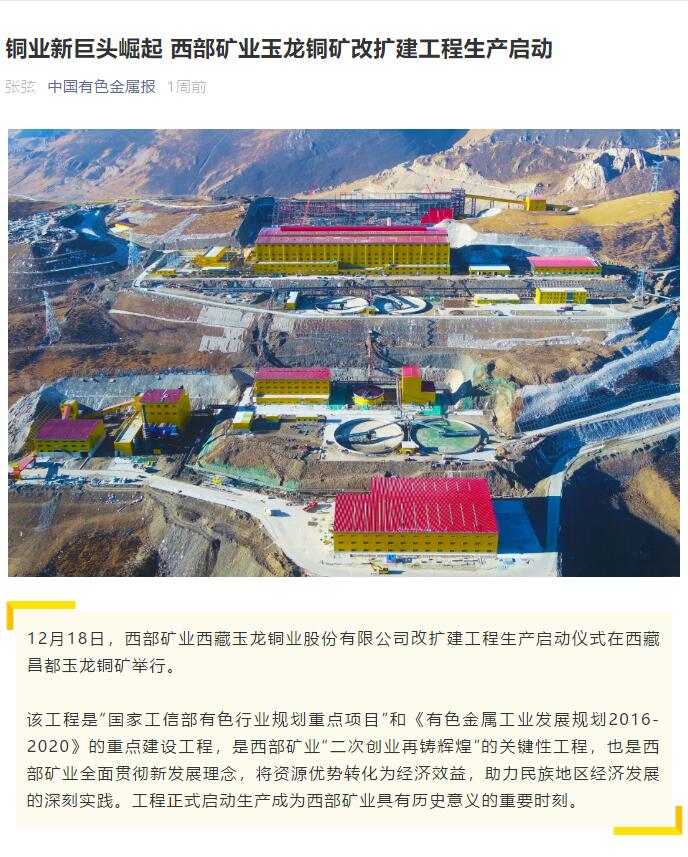 【中国有色金属报】铜业新巨头崛起 西部矿业玉龙铜矿改扩建工程生产启动