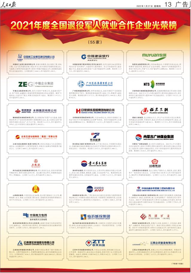 1月27日,《人民日报》发布2021年度“全国退役军人就业合作企业光荣榜”,全国55家企业入围,西部矿业集团有限公司荣登榜单。