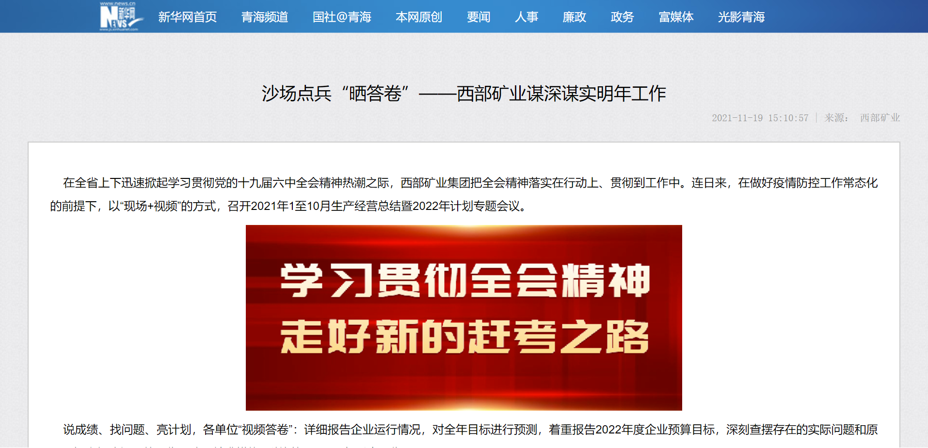 在全省上下迅速掀起学习贯彻党的十九届六中全会精神热潮之际,西部矿业集团把全会精神落实在行动上、贯彻到工作中。连日来,在做好疫情防控工作常态化的前提下,以“现场+视频”的方式,召开2021年1至10月生产经营总结暨2022年计划专题会议。