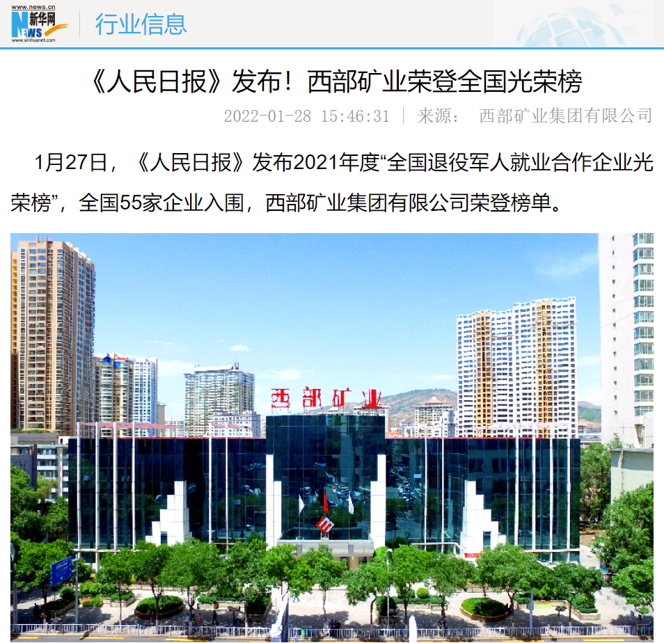 西部矿业集团有限公司,是集矿山冶炼、盐湖化工、文化旅游、建筑地产、金融贸易、科技信息等产业于一体的大型企业集团,中国企业500强。2021年与青海省退役军人事务厅达成就业合作,每年面向自主就业退役军人提供岗位500多个。