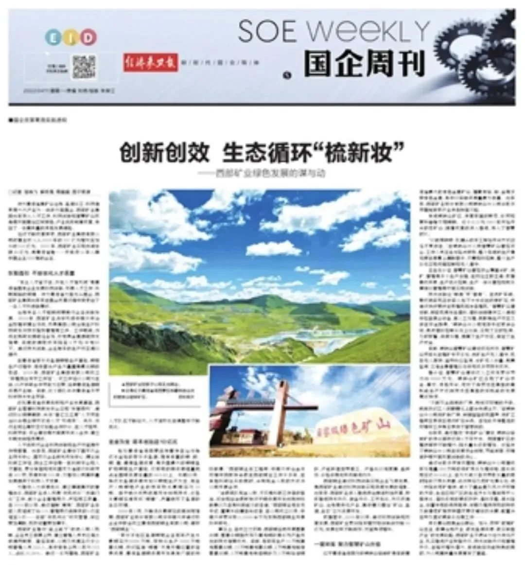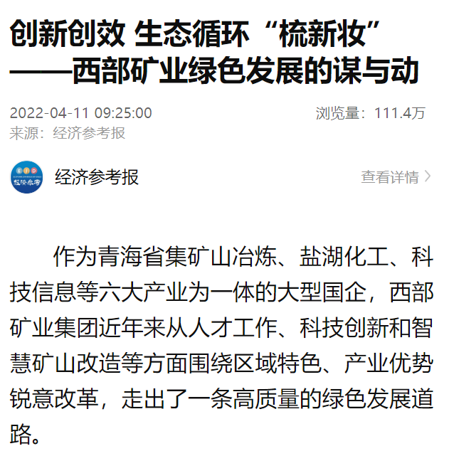 4月11日,新华社以“创新创效 生态循环‘梳新妆’——西部矿业绿色发展的谋与动”为题刊发稿件,深度报道集团公司在人才科技、绿色发展、智能制造等方面的具体做法及取得成效,新华社客户端点击量达110万+。