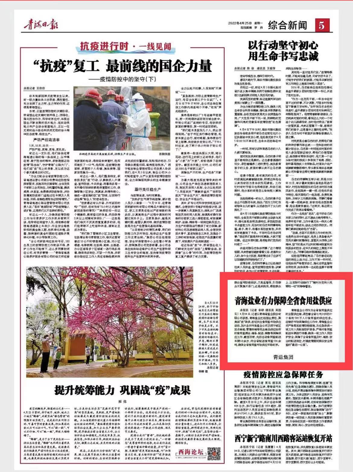 青海盐业公司作为全省食用盐供应的主要供应商,承担着全省七市六州四十个县约598万人口食用盐的供应任务。在做好市场保障供应工作中,青海盐业公司严格落实疫情防控措施,为应急保供一线工作人员配备防护装备,严格对食用盐配送车辆进行消毒,确保一线工作人员防护安全,保障了全省食用盐及时、高效、安全的配送到位,打通疫情期间群众安全用盐的“最后一公里”。