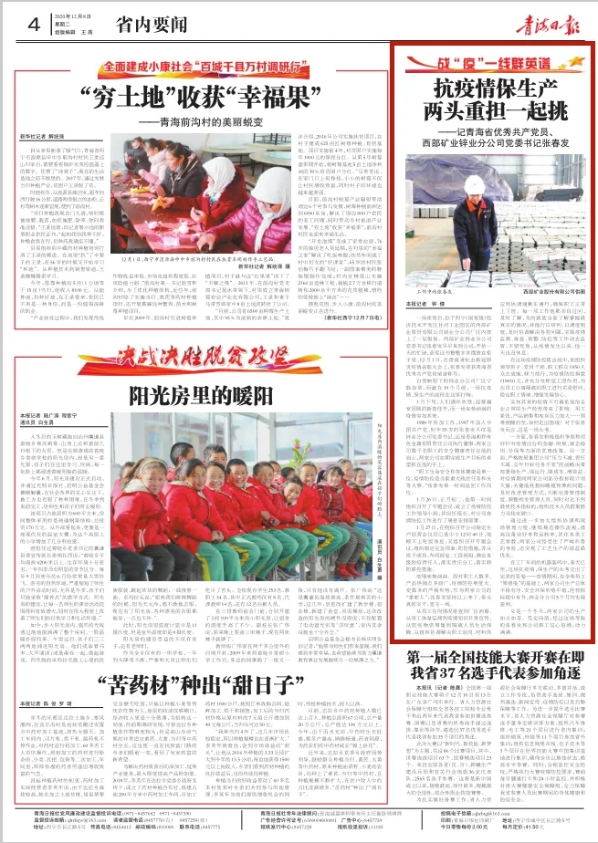 今日,《青海日报》以“抗疫情保生产 两头重担一起挑”为题,宣传报道青海省优秀共产党员、西部矿业锌业分公司党委书记张春发在疫情期间的先进事迹。