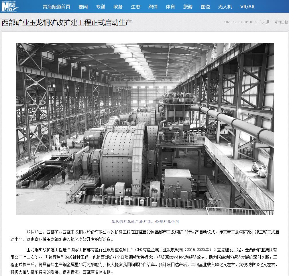 12月18日,西部矿业西藏玉龙铜业股份有限公司改扩建工程在西藏自治区昌都市玉龙铜矿举行生产启动仪式,标志着玉龙铜矿改扩建工程正式启动生产,这也意味着玉龙铜矿进入绿色高效开发的新阶段。