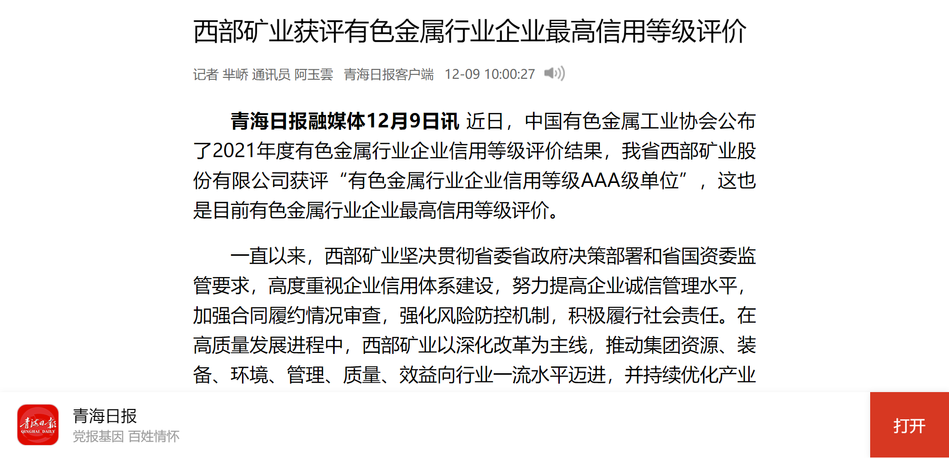 近日,中国有色金属工业协会公布了2021年度有色金属行业企业信用等级评价结果,我省西部矿业股份有限公司获评“有色金属行业企业信用等级AAA级单位”,这也是目前有色金属行业企业最高信用等级评价。