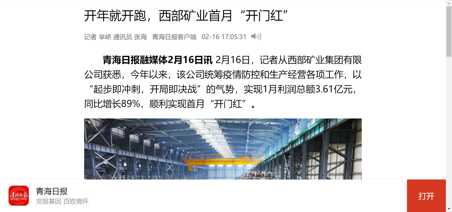 为确保发展提速换挡,该公司战略性新兴产业快速崛起成长,逐步成为新的经济增长点,西部镁业积极拓宽市场,创新销售模式,落实销售激励机制,1月份高纯氧化镁销量较预算增加390.56吨,利润增加42.97万元;《中国推介》栏目摄制的“中国的天空之镜茶卡盐湖”在新华网刊登发布,总浏览量50.7万,同时发布5个海外传播平台,20个国内传播平台,景区影响力进一步提升;由西矿钢构公司承建的首个外部钢结构平台加工制作及安装项目正式开工,标志着西矿钢构公司承接外部项目迈出了关键一步。