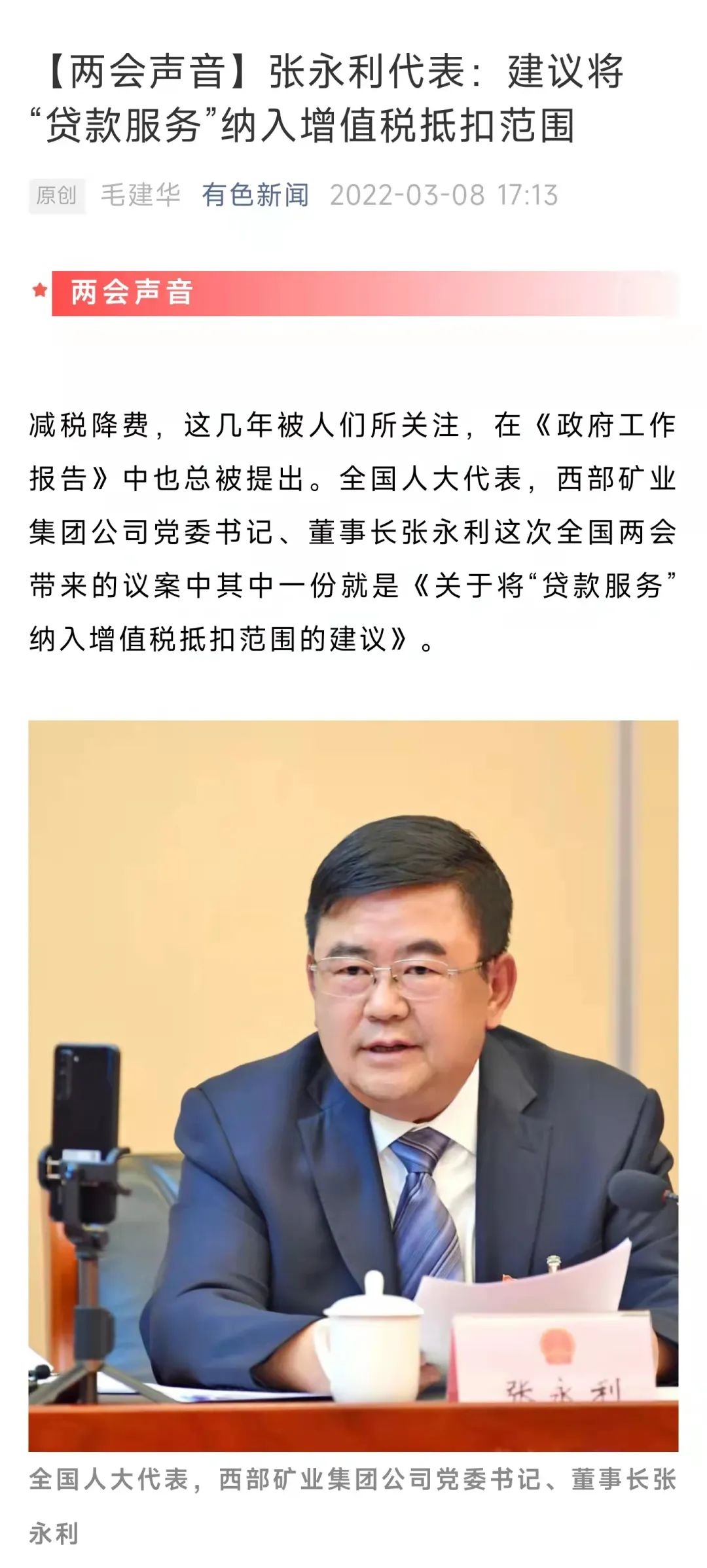 张永利代表在接受《中国有色金属》杂志记者采访时说:“2019年以来,国家通过不断深化增值税改革,陆续出台了多项减税降费政策,包括降低增值税税率,取消不动产分两年抵扣,增加旅客运输服务增值税进项抵扣范围,实行增值税留抵税额返还、加大研发费用加计扣除比例、允许生产及生活性服务业纳税人加计抵减进项税额等一系列措施,实现减税降费约5万亿元(2019年2.36万亿元、2020年2.5万亿元、2021年1.1万亿元),帮助企业纾困解难、更好发展,实现‘放水养鱼’‘水多鱼多’的良性循坏,有力支持了企业健康快速发展。