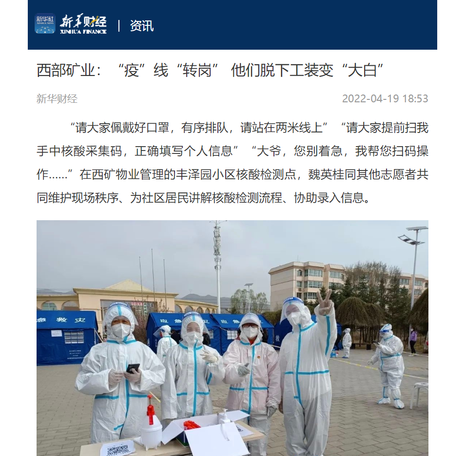 “请大家佩戴好口罩,有序排队,请站在两米线上”“请大家提前扫我手中核酸采集码,正确填写个人信息”“大爷,您别着急,我帮您扫码操作……”在西矿物业管理的丰泽园小区核酸检测点,魏英桂同其他志愿者共同维护现场秩序、为社区居民讲解核酸检测流程、协助录入信息。连日来,西宁市主城区全域实行静态管理,全民开展三轮核酸检测,在迎来的疫情大考中,西部矿业有这么一群可爱的人,他们舍小家、顾大家,奔赴抗击疫情的最前线,积极投身抗疫“主战场”,筑起抗击疫情“护城墙”,驻扎各个小区,积极协助医护人员维护秩序、信息录入、问询指引、消杀,以实际行动诠释国企职工的责任担当,用真诚奉献筑起了防疫长城。