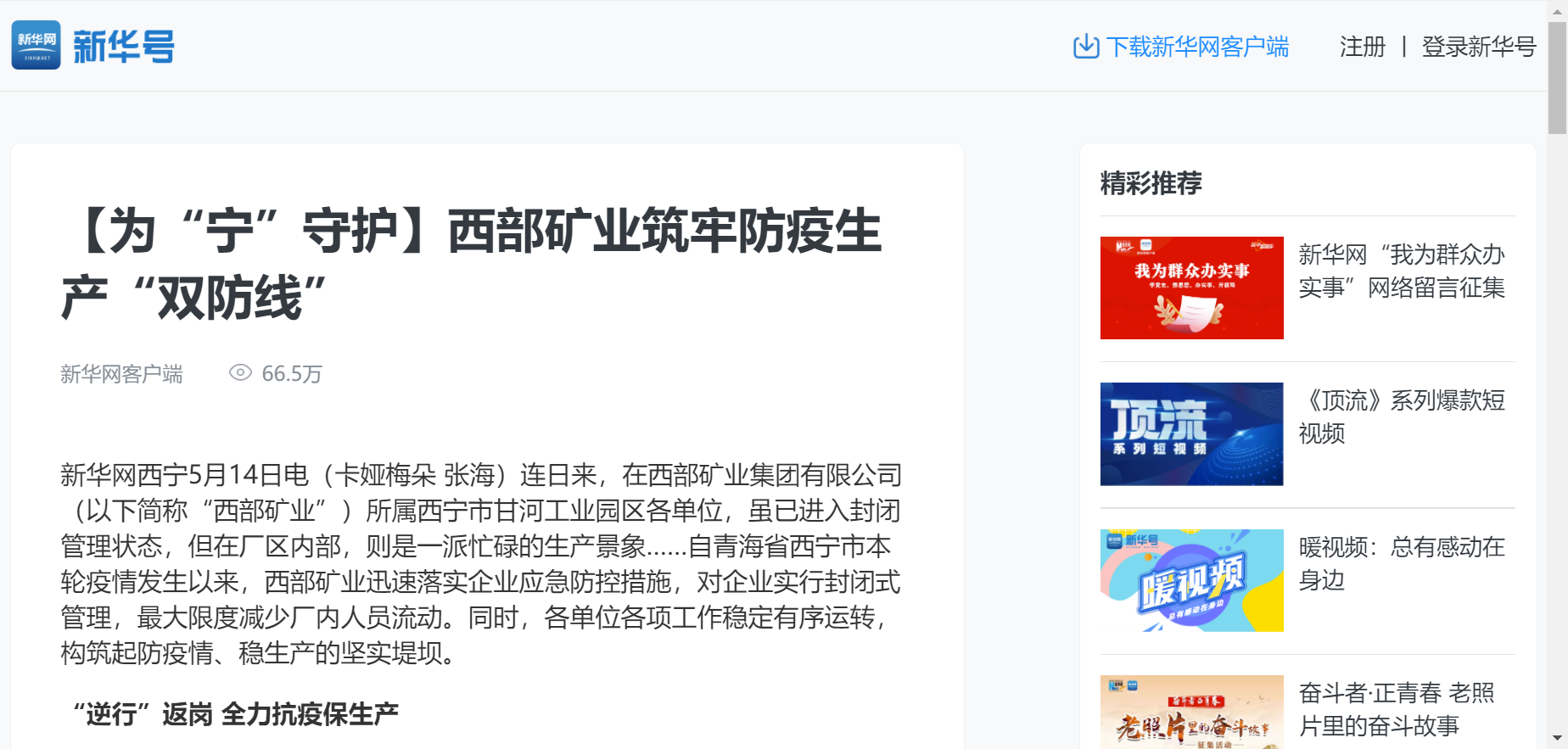 连日来,在西部矿业集团有限公司(以下简称“西部矿业”)所属西宁市甘河工业园区各单位,虽已进入封闭管理状态,但在厂区内部,则是一派忙碌的生产景象……自青海省西宁市本轮疫情发生以来,西部矿业迅速落实企业应急防控措施,对企业实行封闭式管理,最大限度减少厂内人员流动。同时,各单位各项工作稳定有序运转,构筑起防疫情、稳生产的坚实堤坝。
