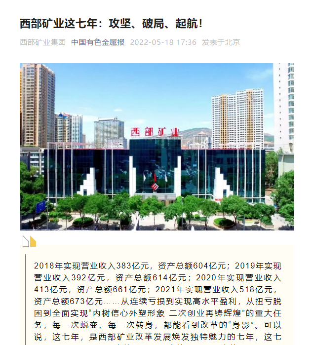 2018年实现营业收入383亿元,资产总额604亿元;2019年实现营业收入392亿元,资产总额614亿元;2020年实现营业收入413亿元,资产总额661亿元;2021年实现营业收入518亿元,资产总额673亿元……从连续亏损到实现高水平盈利,从扭亏脱困到全面实现“内树信心外塑形象 二次创业再铸辉煌”的重大任务,每一次蜕变、每一次转身,都能看到改革的“身影”。可以说,这七年,是西部矿业改革发展焕发独特魅力的七年,这七年,西部矿业因改革而兴,因改革而强,因改革而荣,为西部矿业推动高质量发展留下了浓墨重彩的一笔。