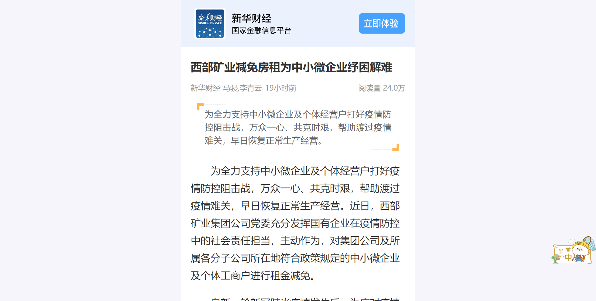 【新华财经】西部矿业减免房租为中小微企业纾困解难