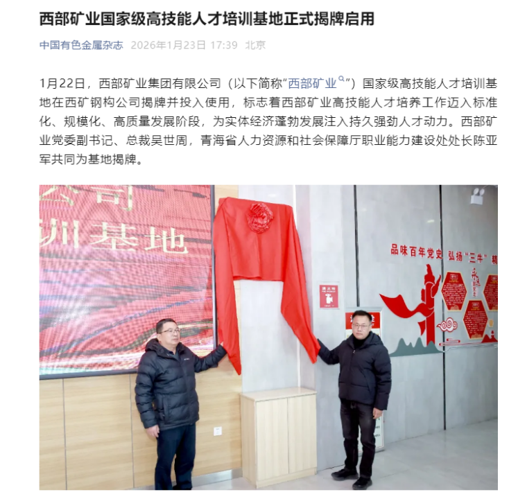 1月22日,西部矿业集团有限公司(以下简称“西部矿业”)国家级高技能人才培训基地在西矿钢构公司揭牌并投入使用,标志着西部矿业高技能人才培养工作迈入标准化、规模化、高质量发展阶段,为实体经济蓬勃发展注入持久强劲人才动力。西部矿业党委副书记、总裁吴世周,青海省人力资源和社会保障厅职业能力建设处处长陈亚军共同为基地揭牌。