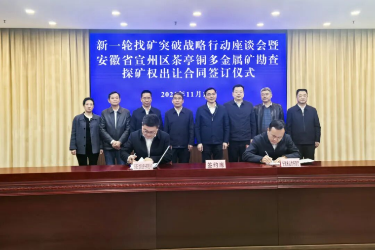 11月19日,新一轮找矿突破战略行动座谈会暨安徽省宣州区茶亭铜多金属矿勘查探矿权出让合同签订仪式在安徽举行,公司所属玉龙铜业公司与安徽省自然资源厅签订茶亭铜多金属勘查探矿权出让合同,标志着玉龙铜业公司对该矿业权获取工作全面依法落地。