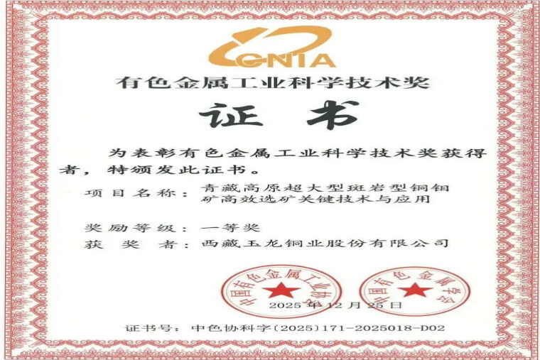 西藏玉龙铜业公司获有色金属工业科学技术一等奖
