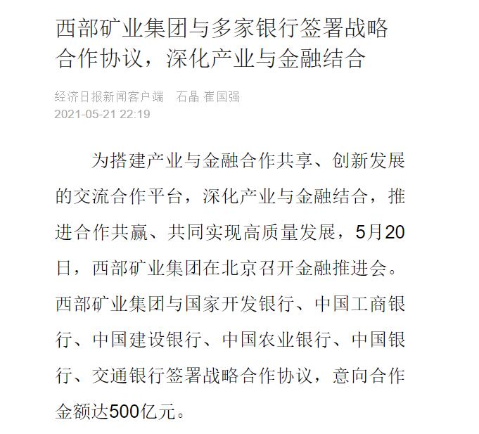 为搭建产业与金融合作共享、创新发展的交流合作平台,深化产业与金融结合,推进合作共赢、共同实现高质量发展,5月20日,西部矿业集团在北京召开金融推进会。西部矿业集团与国家开发银行、中国工商银行、中国建设银行、中国农业银行、中国银行、交通银行签署战略合作协议,意向合作金额达500亿元。