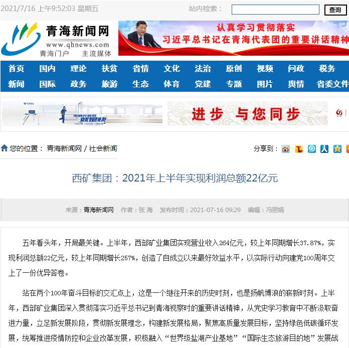 五年看头年,开局最关键。上半年,西部矿业集团实现营业收入264亿元,较上年同期增长37.87%,实现利润总额22亿元,较上年同期增长257%,创造了自成立以来最好效益水平,以实际行动向建党100周年交上了一份优异答卷。