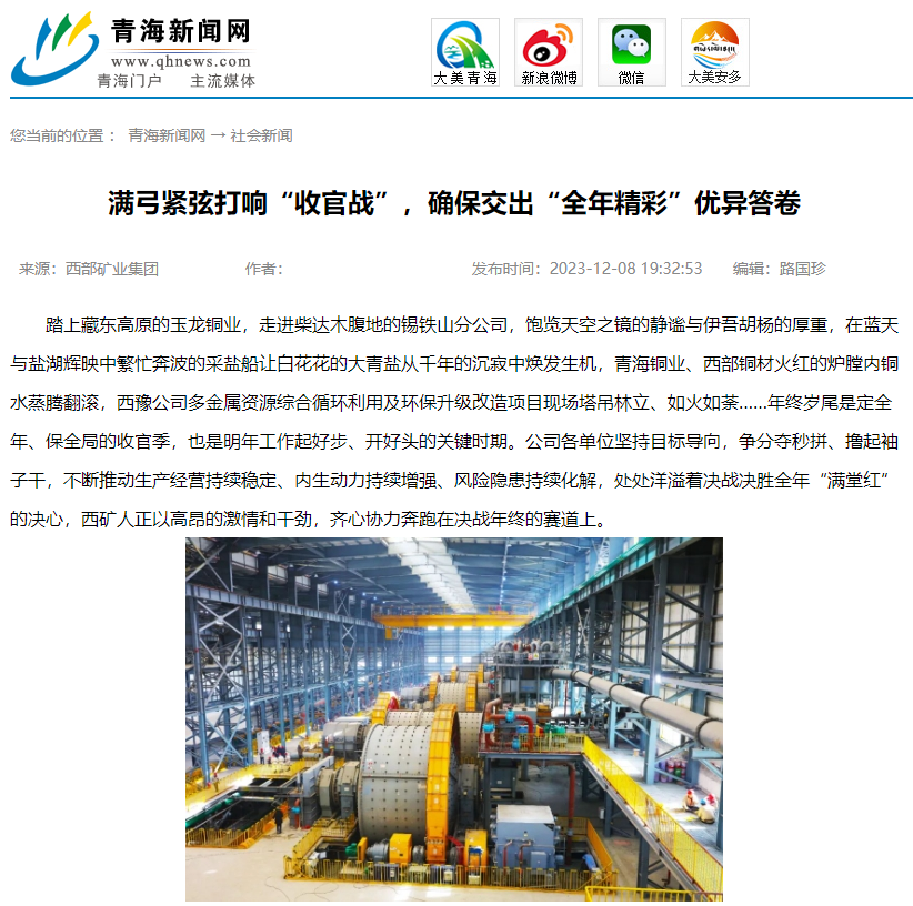 踏上藏东高原的玉龙铜业,走进柴达木腹地的锡铁山分公司,饱览天空之镜的静谧与伊吾胡杨的厚重,在蓝天与盐湖辉映中繁忙奔波的采盐船让白花花的大青盐从千年的沉寂中焕发生机,青海铜业、西部铜材火红的炉膛内铜水蒸腾翻滚,西豫公司多金属资源综合循环利用及环保升级改造项目现场塔吊林立、如火如荼……年终岁尾是定全年、保全局的收官季,也是明年工作起好步、开好头的关键时期。公司各单位坚持目标导向,争分夺秒拼、撸起袖子干,不断推动生产经营持续稳定、内生动力持续增强、风险隐患持续化解,处处洋溢着决战决胜全年“满堂红”的决心,西矿人正以高昂的激情和干劲,齐心协力奔跑在决战年终的赛道上。