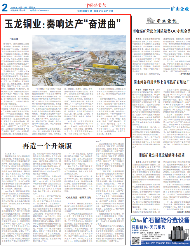 11月8日选矿厂二车间顺利试生产以来,在集团公司党委坚强领导下,玉龙铜业公司把最快实现达产达标作为首要任务,上下一心、群策群力,通过查设计漏项、查工程质量及隐患、查未完工程量,整改工作定任务、定人员、定时间、定措施的“三查四定”,充分发挥技术优势,仔细排查制约生产指标的“难点”“痛点”问题,切实做到在一线发现问题、在一线解决问题、在一线推动工作、在一线抓好落实,真正使选矿厂二车间产量和各项指标趋于健康稳定。