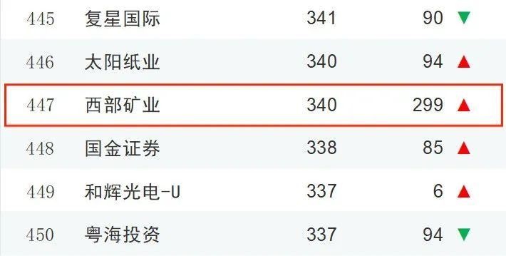 近日,Wind最新发布2023年度“中国上市企业市值500强”榜单,西部矿业股份有限公司以市值340亿元新进500强榜单,排名上升299位,位列第447位。