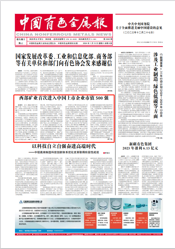 此次入选中国上市企业市值500强,代表了行业、市场对西部矿业股份有限公司发展现状、未来前景以及资本市场形象的认可。西部矿业将继续秉承“成为股东满意、员工幸福、备受社会尊重和具有国内重要影响力的企业”愿景,立足自身资源优势、技术优势和人才优势,坚持优化产业布局不动摇,加大矿产资源勘探力度,持续优化工艺流程,提升科技创新能力,加强市值管理,树牢“安全效益观”“质量效益观”“管理效益观”“形象效益观”,不断增强国有经济竞争力、创新力、控制力、影响力和抗风险能力,不断推动公司朝着高质量发展目标奋勇前进。