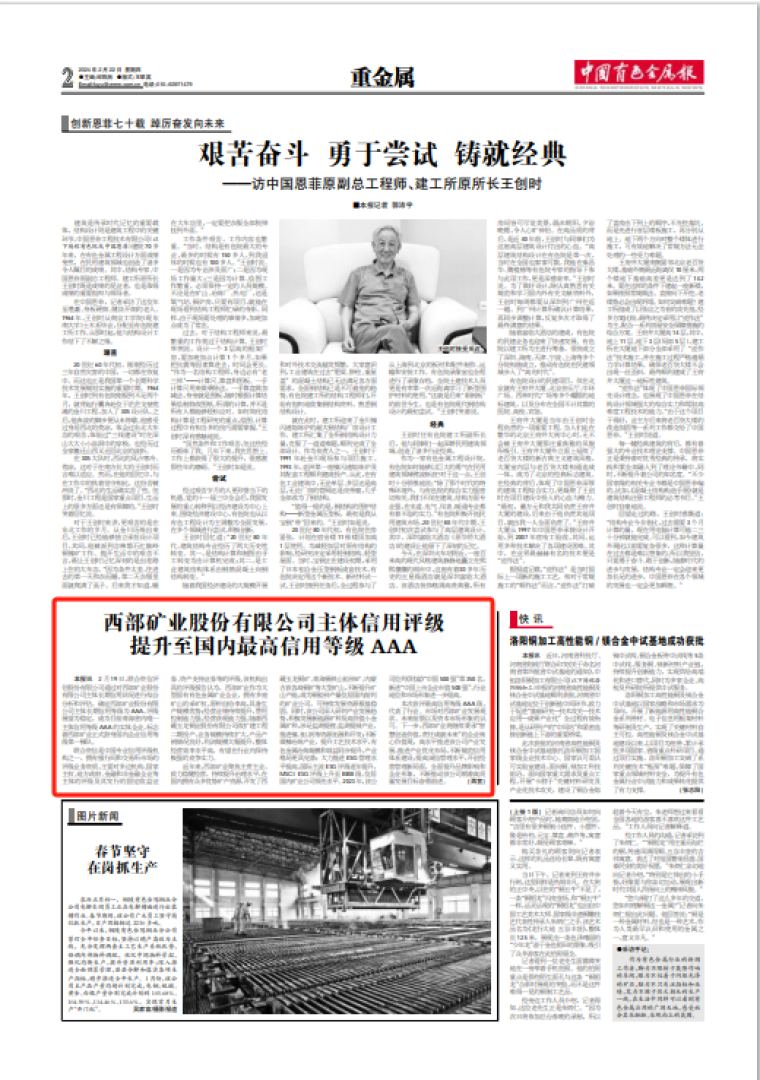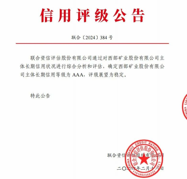 2024年2月19日,联合资信评估股份有限公司通过对西部矿业股份有限公司主体长期信用状况进行综合分析和评估,确定西部矿业股份有限公司主体长期信用等级为 AAA,评级展望为稳定,成为目前省内唯一主体信用等级AAA的实体企业,标志着西部矿业正式跻身国内企业信用等级第一梯队。