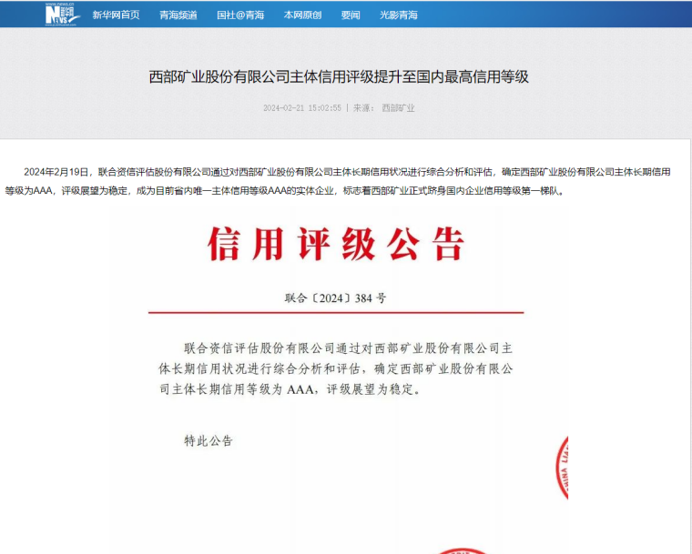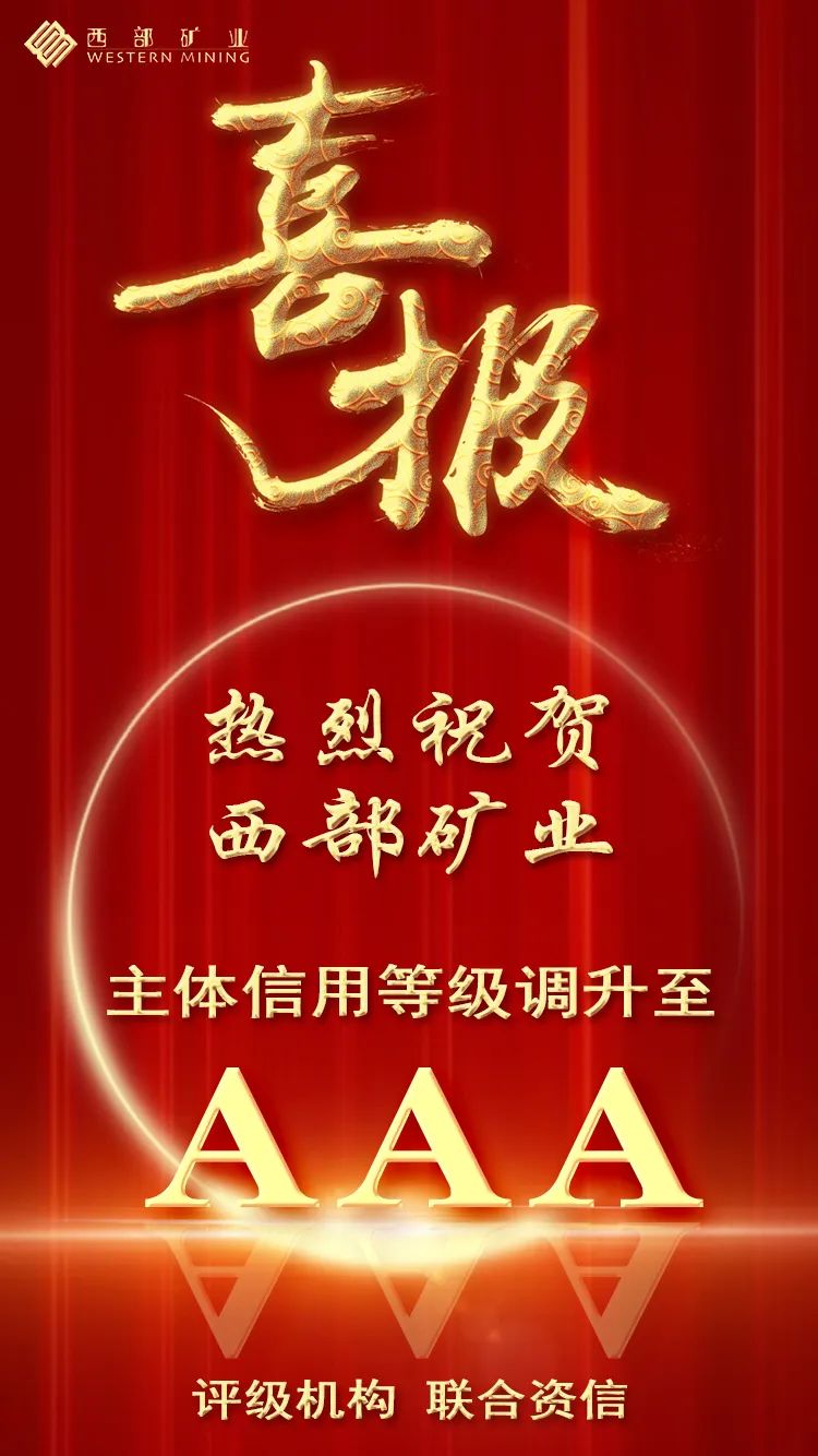 2024年2月19日,联合资信评估股份有限公司通过对西部矿业股份有限公司主体长期信用状况进行综合分析和评估,确定西部矿业股份有限公司主体长期信用等级为 AAA,评级展望为稳定,成为目前省内唯一主体信用等级AAA的实体企业,标志着西部矿业正式跻身国内企业信用等级第一梯队。
