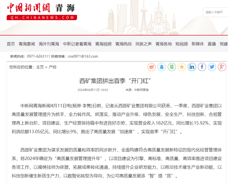 春风送暖催奋进,最是一年好时光。一季度,西部矿业集团坚持以习近平新时代中国特色社会主义思想为指导,全面贯彻党的二十大和中央经济工作会议精神,深入落实省委省政府决策部署,聚力高质量发展首要任务,严格落实集团公司“两会”提出的各项工作要求,以高质量发展管理提升为抓手,全力转作风、抓落实,推动产业升级、绿色发展、安全生产、科技创新、合规管理再上新台阶,项目建设、生产经营保持稳中有进良好态势,实现营业收入182亿元,同比增长15.92%,实现利润总额13.05亿元,同比增长9%,跑出了高质量发展“加速度”,实现首季“开门红”。