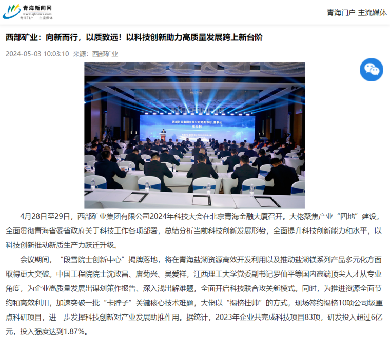 【青海新闻网】西部矿业:向新而行,以质致远!以科技创新助力高质量发展跨上新台阶