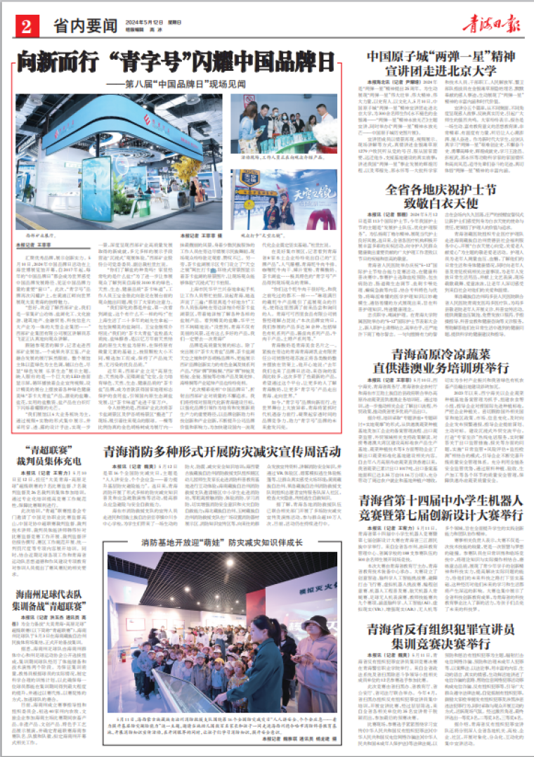 汇聚优秀品牌,展示创新实力。5 月 10 日,2024 年中国品牌日活动在上 海世博展览馆开幕,自 2017 年起,每 年的“中国品牌日”都会成为世界感受 中国品牌发展路径、见证中国品牌力 量的重要“窗口”。此次,“青字号”品 牌再次闪耀沪上,在黄浦江畔向世界 展现大美青海的独特魅力。