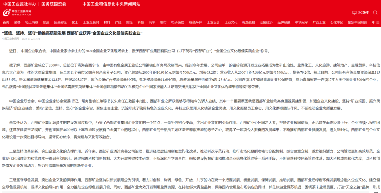 【中国工业新闻网】“坚信、坚持、坚守”助推高质量发展,西部矿业被授予“全国企业文化最佳实践企业”称号