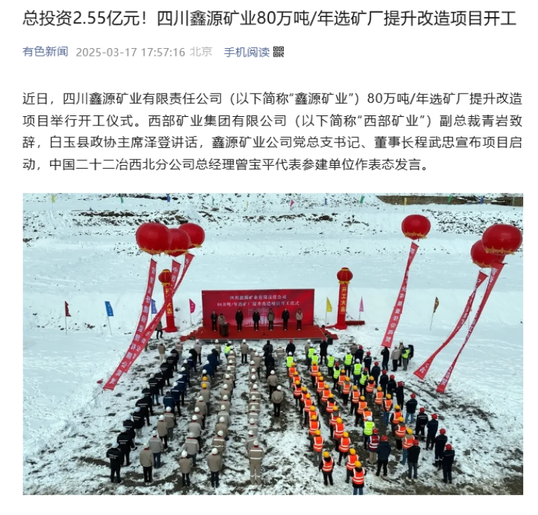近日,四川鑫源矿业有限责任公司(以下简称“鑫源矿业”)80万吨/年选矿厂提升改造项目举行开工仪式。西部矿业集团有限公司(以下简称“西部矿业”)副总裁青岩致辞,白玉县政协主席泽登讲话,鑫源矿业公司党总支书记、董事长程武忠宣布项目启动,中国二十二冶西北分公司总经理曾宝平代表参建单位作表态发言。