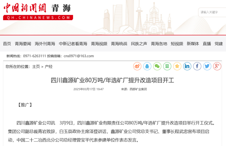 作为川西高原首座高原绿色智能矿山,鑫源矿业80万吨选厂改造项目是公司聚焦“设备大型化、控制智能化、管理数字化”三大目标,推动绿色矿业发展、资源高效利用及产业升级,实现可持续发展的具体举措。项目总投资2.55亿元,建设周期预计7个月,项目将采用国际先进的选矿技术和一流设备,建成后将实现年处理矿石量80万吨,销售收入年产值可达8亿元以上,上缴税收1.5亿元。