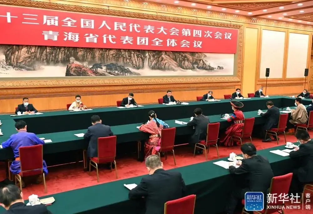 在认真听取代表发言后,习近平作了讲话。习近平充分肯定青海一年来工作和“十三五”时期发展,希望青海的同志全面贯彻落实党中央决策部署,完整、准确、全面贯彻新发展理念,坚持以人民为中心,坚持稳中求进工作总基调,持续深化改革开放,统筹发展和安全,弘扬光荣传统和奋斗精神,把坚持生态优先、推动高质量发展、创造高品质生活部署落到实处,在推动青藏高原生态保护和可持续发展上不断取得新成就,书写新时代青海新篇章。