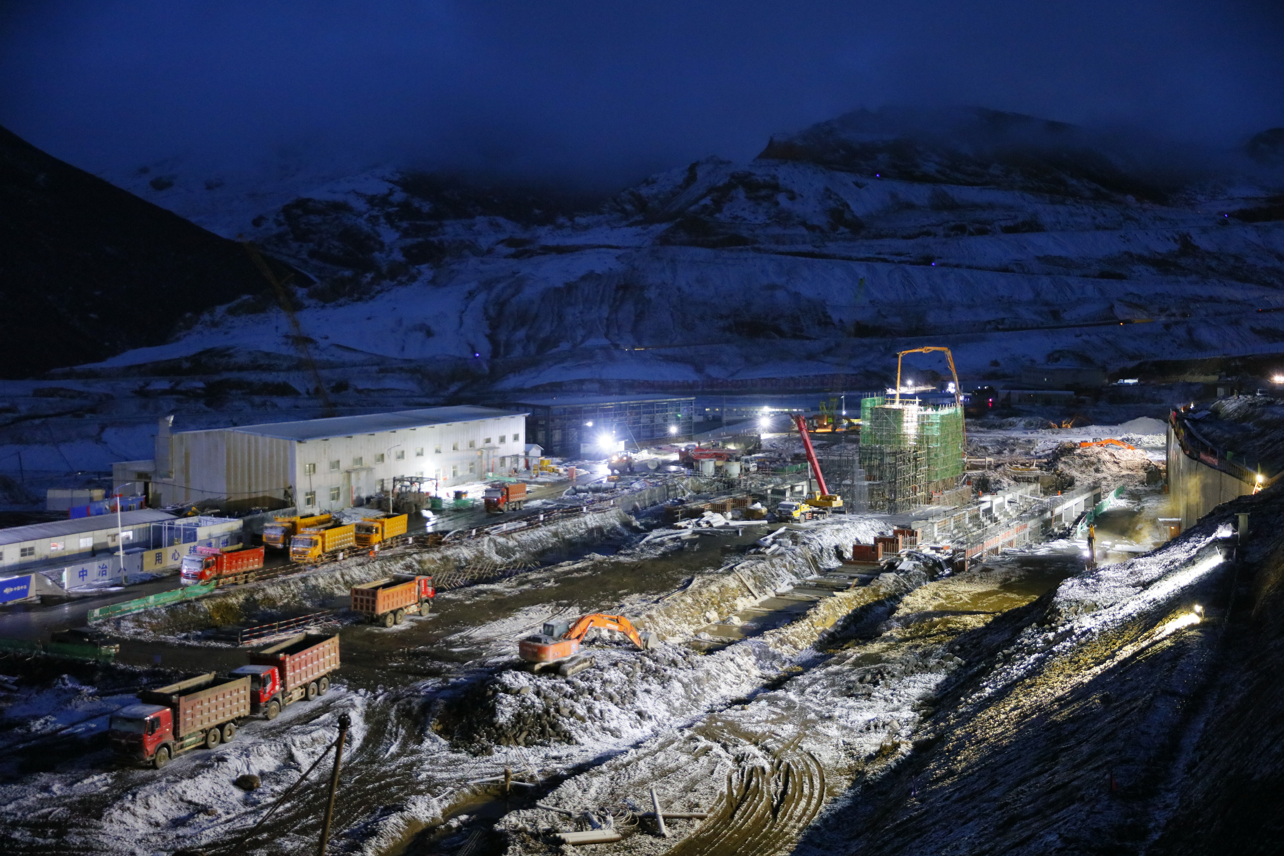 在项目建设现场,每一个人都放弃了白天黑夜、晴天雪天的概念,加班加点与时间赛跑。来来回回的运载车、轰隆作响的机器声,到处是建设者们忙碌的身影,在灯光的映衬下,他们的形象都显得格外伟岸,与远处白皑皑的雪山交相辉映,构成建设现场最美的夜景。