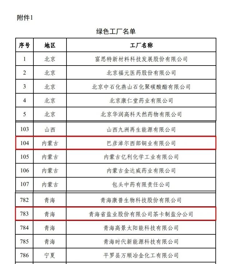 日前,从国家工业和信息化部办公厅传来喜讯,公司所属巴彦淖尔西部铜业有限公司、青海省盐业股份有限公司茶卡制盐分公司成功获评国家级绿色工厂。