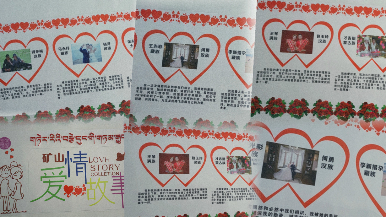 没有都市的灯红酒绿和繁杂喧哗,玉龙铜业安静的坐落在宁静山下。走进玉龙铜业办公楼,楼道里的一排文化墙格外吸引人——九对夫妻组成的“矿山爱情故事”在火红玫瑰的簇拥下讲述着在海拔4600米的玉龙铜矿的相遇、相爱,坚持、坚守。
