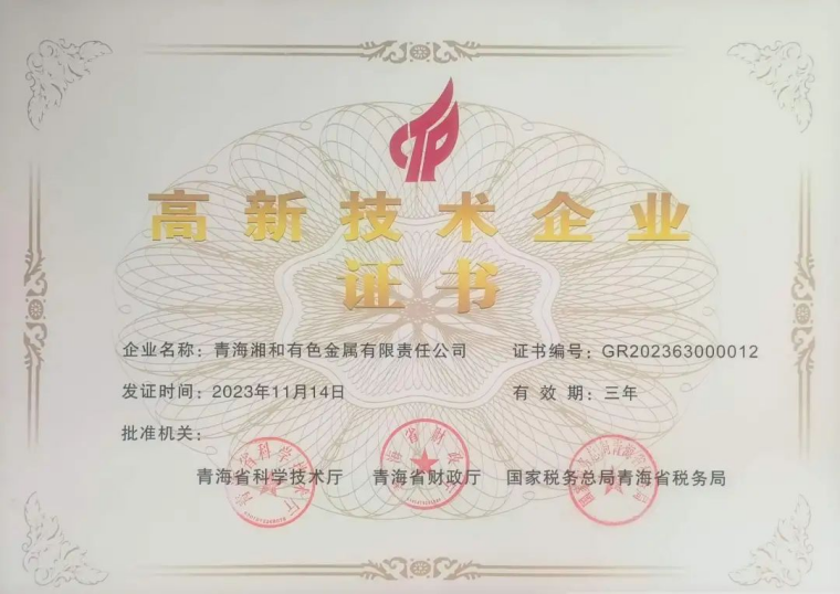 近日,青海省科学技术厅、青海省财政厅及国家税务总局青海省税务局联合印发《关于公布青海省2023年认定高新技术企业名单的通知》,认定青海湘和有色金属有限责任公司为青海2023年高新技术企业之一,并颁发高新技术企业证书。