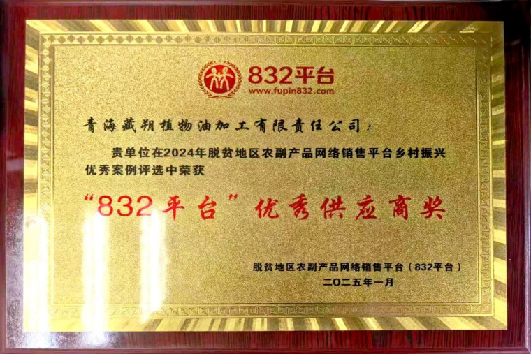 1月24日,西部矿业帮扶绿色生态植物油加工项目——青海藏朔植物油加工有限责任公司荣获“832平台”优秀供应商奖。