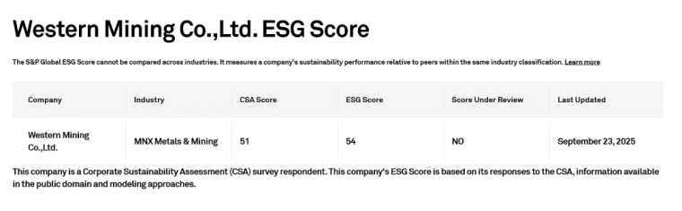 9月25日,全球最主要的评级公司标普全球更新ESG评分,西部矿业得分名列前茅,持续升高至54分(CSA Score 51,ESG Score 54),超越全球84%矿业企业。